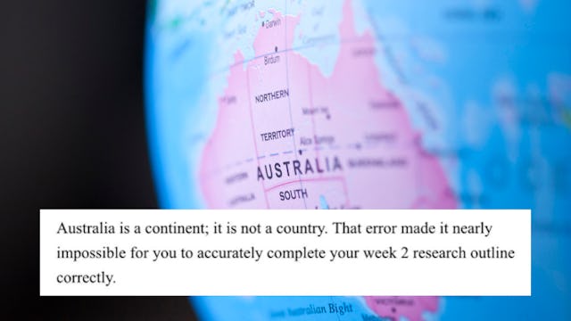 Arnold wrote her professor back saying that, actually, Australia is very much a country. She even provided references. References. To prove that Australia is a country. “I believe I got zero or partial credit because the instructor said, ‘Australia is a continent; not a country,'” Arnold wrote in her e-mail protesting the grade. “However, I believe that Australia is a country. The research starter on the SNHU’s Shapiro library written by John Pearson (2013) states, that Australia is the ‘sixth-largest country in the world’ (n.p.). The full name of the country is the Commonwealth of Australia, meaning Australia is both a continent and a country. Therefore, these sections of the rubric should be amended.”