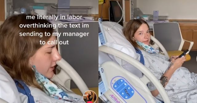 The video is overlaid with: “Me literally in labor overthinking the text I’m sending to my manager to call out.”