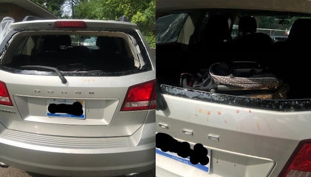 Guyton says she tried to unlock the door using the touch sensor on her door handle, and the door didn’t unlock. “I had my grandma call 911 immediately while I grabbed a huge chunk of asphalt off the ground and start bashing it on my front passenger window as hard as I could and it was doing nothing,” she says. “My grandpa gave me a window breaker and that did nothing.”