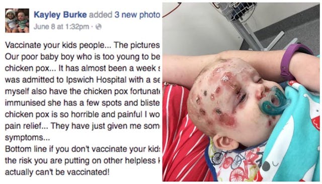 Posted on Facebook, alongside a passionate rant from his mother, the photos show young Elijah, an 11-month-old who is too young to be vaccinated for chickenpox, covered in sores. They are extremely difficult to see.