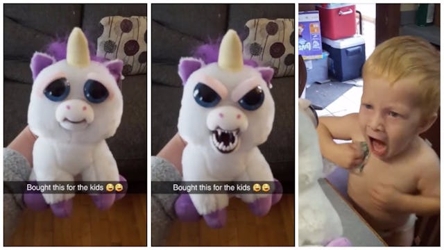 In a super viral Facebook post that’s been shared over a million times, mom-of-four Jessica Mags scares the ever-loving shit out of her adorable kid with a toy that looks to be straight from the bowels of hell. First it’s a sweet looking plush unicorn, but once you squeeze it, it turns into a demon doll with glaring eyes and a mouthful of jagged teeth. Observe: