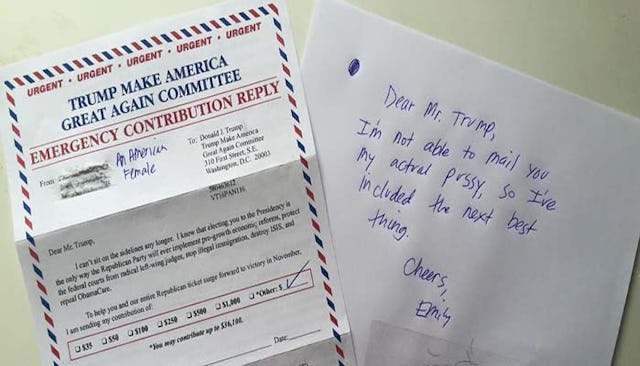 “Dear Mr. Trump,” she wrote in a letter that she shared on Facebook. “I am not able to mail you my actual pussy so I’ve included the next best thing.” Then she mailed the letter – and her pubes – in the preaddressed envelope in the mailer.