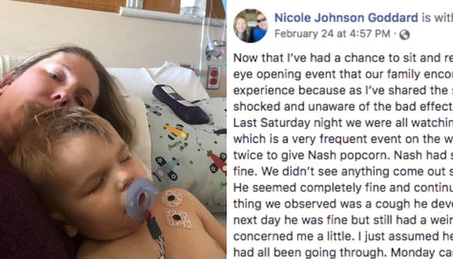 Happily, Goddard tells Scary Mommy that Nash is recovering nicely. “He’s doing great!” she says. “I’ve gotten a lot of positive feedback mostly parents unaware of the dangers of popcorn to young kids. I myself was unaware of it until we went through what we did.”