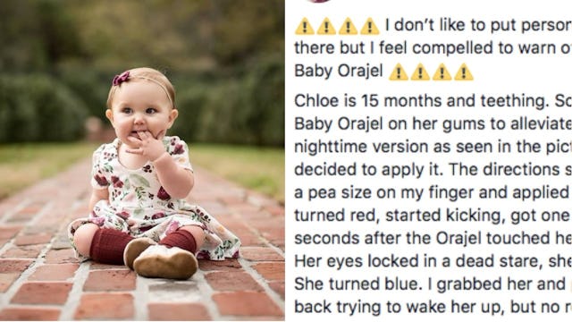 “Unfortunately I did not know this in advance, but there are many other parents out there who have experienced the exact same occurrence with their own children when using Baby Orajel. I found online posts dating back to 2008 from parents with literally the same experience – their baby became unresponsive in seconds, went limp, turned blue, became responsive again after 15 seconds or so – it was like someone wrote my same experience,” she wrote. “What’s more, I learned the FDA warns against giving babies Benzocaine – the active ingredient in Baby Orajel.”
