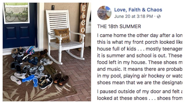 She shares that having all those shoes piled up on her porch during this “last summer” means her kids are home — she knows where they are, who they’re with, and, most importantly, that they’re all safe. And while “the 18th summer” doesn’t necessarily mean her children won’t be home during the summer months ever again, it could. And once your children have ventured off to experience college or wherever their path leads them, it’s very different when they come home again.