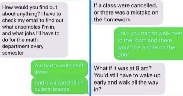 In the text, her friend and her son’s conversation (over text, of course) started out innocently enough. “How did any of college work before email?” he asked. “Like what did you do? If a class were cancelled, or there was a mistake on the homework”. His mom gently explained you actually just went to class and if there was a problem, the teacher would leave a note on the door.