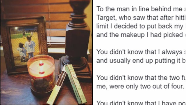 Erin Bennett of Virginia, a mom of four, shared the heartfelt story on her Facebook page in a post many of us can relate to. “To the man in line behind me at the Gainesville Target, who saw that after hitting my grocery budget limit I decided to put back my Pumpkin Spice candle and the makeup I had picked out,” she writes. “You didn’t know that I always save my stuff for last and usually end up putting it back.”