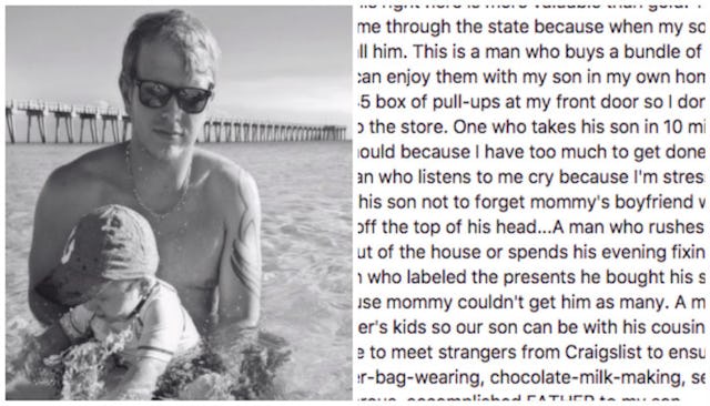 “This is my ex. This right here is more valuable than gold. This is a man who doesn’t pay a dime through the state because when my son needs new clothes, I just call him. This is a man who buys a bundle of kids’ movies on Vudu so even I can enjoy them with my son in my own home. A man who drops off the $45 box of pull-ups at my front door so I don’t have to load him up and go to the store.”
