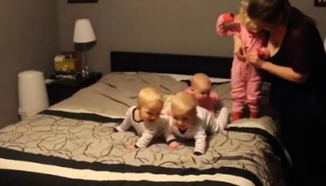 In a video posted on The Baby Gang Facebook page, Corrie Whyte corrals two-year-old Emily and eight-month-old triplets Jackson, Olivia, and Levi, on her bed and tries to get all of them dressed. She starts with one of the babies, and the other three crawl and jump around the bed as she snaps up her baby’s onesie with the quickest fingers I’ve ever seen — seriously, this lady is a pro.