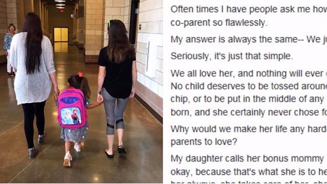Booth explains that her daughter didn’t choose for her parents to live separately, so why would they put her in a position to make an already difficult situation worse? “Why would we make her life any harder by making her choose which set of parents to love?” Booth asks. “My daughter calls her bonus mommy ‘Mommy’.. and you know what? That’s okay, because that’s what she is to her, she IS her mommy. She is there for her always, she takes care of her, she plays with her, she teaches her life lessons and how she should behave, she gives her hugs and kisses goodnight, she does everything any mother would do.”