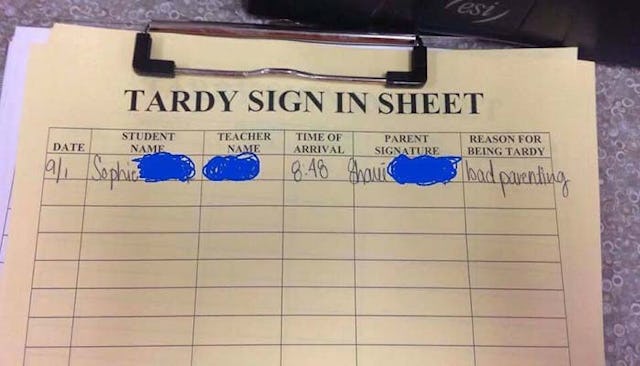 The mom wrote in, “bad parenting” under the “reason for being tardy” column and one would argue that being late doesn’t necessarily mean your parenting was at fault, but sometimes, it is. And plenty of Redditors weighed in with their tales of being chronically late to school back in the day, making their own kids late and just plain silliness.