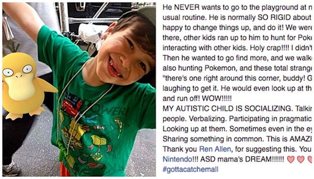 There have been a lot of complaints about the game since it surfaced, but this story proves nothing is all bad. “My autistic child is socializing. Talking to people. Smiling at people. Verbalizing. Participating in pragmatic speech. With total strangers. Looking up at them. Sometimes even in the eye. Laughing with them. Sharing something in common. This is AMAZING.”
