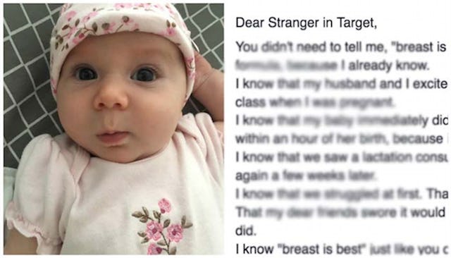 Women are shamed for breastfeeding all the time, but too often we forget that formula feeding moms take just as much shit. Case in point: a Florida mom who recently wrote an open letter to a woman in Target she says rudely reminded her “breast is best” as she was buying a can of formula for her daughter.
