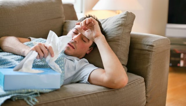 My husband has been under the weather for the last few days. Yesterday, he took the day off work and spent the majority of it huddled on the couch under a pile of tissues. He looked pretty miserable, and to his credit, he didn’t complain once about how awful he felt, didn’t ask me to touch his forehead to “see if it feels hot,” and didn’t wonder aloud if he might possibly have contracted pneumonia, Ebola or the plague. As you’ve probably already guessed, this is not our first rodeo.