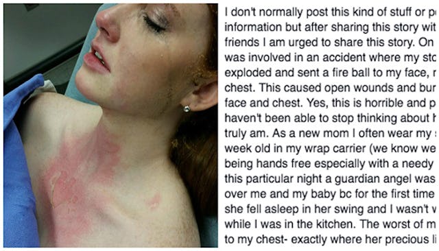 Molly Landis often wears her four-week old daughter in a baby carrier on her chest. As luck would have it, Landis’ daughter fell asleep in her swing the other night, which meant she was out of harm’s way when a kitchen explosion caused massive burns to Landis’ neck and face — the exact spot where her daughter’s head would have been had she been in her usual place in the baby carrier. Landis shared the story and a photo of her injuries on Facebook as a warning to other parents who, like her, use a baby carrier as a way to comfort their baby while they get things done in the kitchen.
