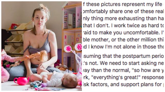 In a post that’s since gone viral, she writes, “Chances are, you’re feeling pretty uncomfortable right now (trust me I am too). I’m going to challenge you to push past the discomfort society has placed on postpartum mental illness and hear me out.”