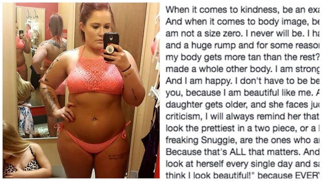 “When it comes to body image, be an example,” Johnson concludes her post. “I am not a size zero. I never will be. I have big thighs and a huge rump and for some reason the middle of my body gets more tan than the rest? But this body made a whole other body. I am strong. I am able. And I am happy. I don’t have to be beautiful like you, because I am beautiful like me…
