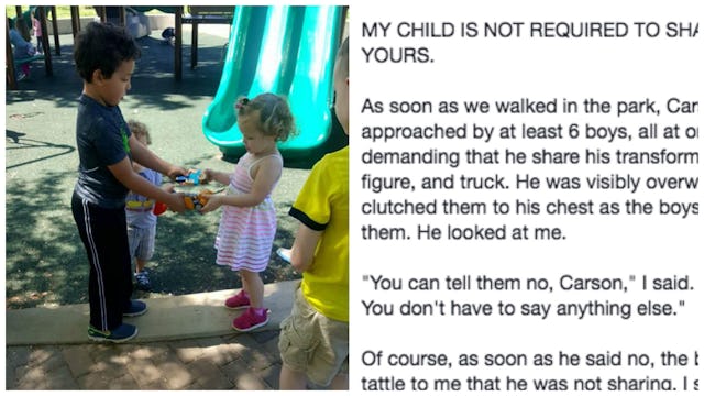 Kolberg explains that her son was approached by at least six boys all at once, demanding her son share his toys. When he shot a visibly overwhelmed look at his mom, she explained that he didn’t have to share.