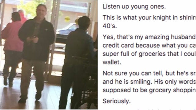 She shared a picture of her smiling husband arriving at the grocery store to save the day after she found herself at the register without any legal tender. An embarrassing moment for her, and surely an inconvenient one for him, having occurred in the middle of the work day. You wouldn’t know it, though.