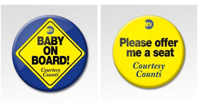 Luckily the Metropolitan Transportation Authority has a plan to help, at least for those in the tri-state area. From now until Labor Day, MTA is offering free “Baby on Board” buttons to pregnant women with the hope that seeing a woman wearing one will encourage other riders to offer up their seat.