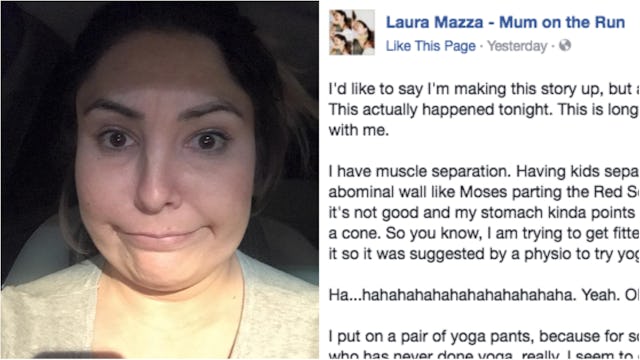 Laura Mazza, the Australian writer behind the blog Mum on the Run, is recovering from something many of us moms are all too familiar with — diastasis recti, more commonly known as a separation of the abdominal muscles that can happen after pregnancy. “Having kids separated my abdominal wall like Moses parting the Red Sea,” Mazza writes. “Yeah it’s not good and my stomach kinda points out like a cone. So you know, I am trying to get fitter and fix it so it was suggested by a physio to try yoga.”
