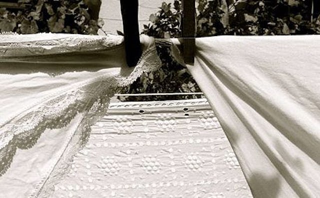 What my mother taught me is that laundry, though relentless, can be hung on a rope, a branch, a hanger, or on the back of an Adirondack chair. It can be wrung out in the sink and hung on the shower curtain rod or passed through two rollers cranked by hand under birch trees where we wash our summer clothing in lake water.