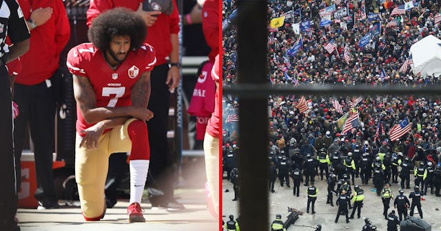 They’re referring, of course, to Colin Kaepernick’s 2016 protests against police brutality and racism, when he took a knee on the field instead of standing for the National Anthem. His quiet, peaceful protest drew ire from Republicans and, most vocally, Trump.