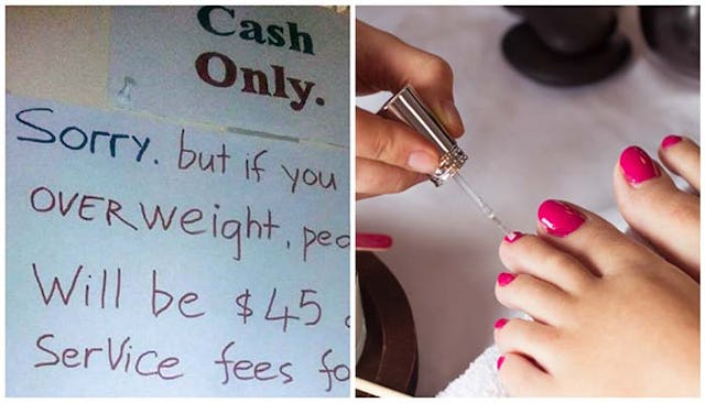 There’s so much WTF going on with a policy like this, it’s hard to know where to start. A basic pedicure at Rose Nail costs $25.30. The salon is charging overweight customers over 77% more, because why exactly? And what determines whether or not you’re overweight by the salon’s standards? The average American woman is a size 14-16, would they be subjected to this fat tax? What about pregnant women? Do they automatically get the fat pricing too? Will stopping for fries on the way to the salon mean having to pony up an additional $19.70?