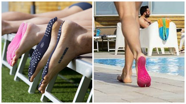 Apparently you can wear them on a hot sandy beach, in the pool, on blacktop and even at the spa. And while it would be nice not to have your feet scorched on a hot summer day, isn’t the point of going barefoot so you can feel the sand under your feet? Or the grass between your toes? Or the lukewarm standing shower water at the gym that hundreds of sweaty strangers have stood in before you?