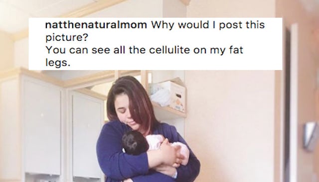 “Why would I post this picture? You can see all the cellulite on my fat legs,” she writes in the caption. “My stomach looks huge, like I am still pregnant. My ankles are so swollen they look like logs. You can see the pad in my unflattering hospital panties. I have no makeup on and my hair hasn’t been brushed in days.”