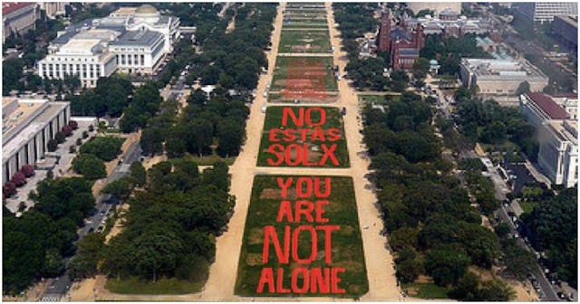 The quilt displays the words of 3,000 survivors of rape and abuse, sewn into red fabric. When viewed collectively, the Monument Quilt reads “You are not alone,” in both English and Spanish. The concept was created and orchestrated by the organization FORCE: Upsetting Rape Culture and features stories collected from survivors and their allies all across the country.