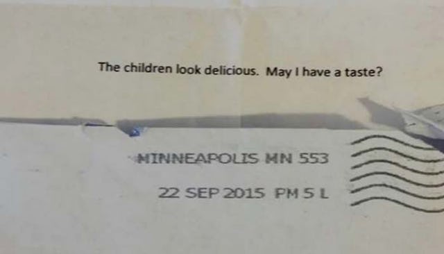 A Minnesota family with elementary school-aged children received an anonymous threat last month that read, “The children look delicious. May I have a taste?” They were justifiably creeped out, so they called police and took to a neighborhood Facebook group to tell others in the neighborhood about it.