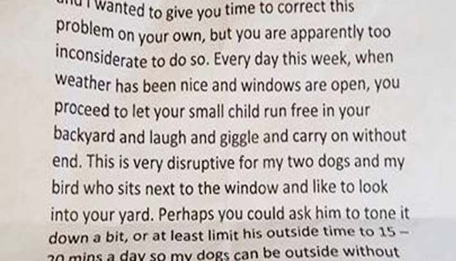 Wow. This neighbor really thinks a mom should force her kids to get only 20 minutes of sunshine a day because the laughter of small children disturbs his dog and bird? Not sure this is actually a crime the police will respond to. Also, nice try with the anonymous note shoved into a mailbox, but it probably won’t be too hard to figure out which “neighbor” left it. Mom just needs to look out for a couple disgruntled pets and the smell of bitterness.