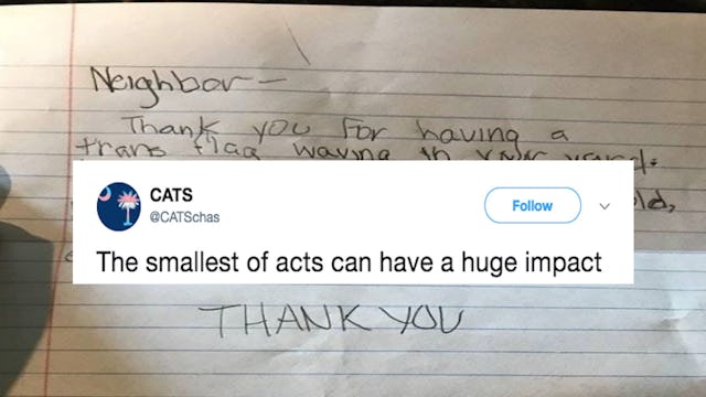 Thank you for having a trans flag waving in your yard. I am a 15-year-old trans boy living in an unsupportive household, but every time I see your flag, I feel better. I appreciate your existence and pride.