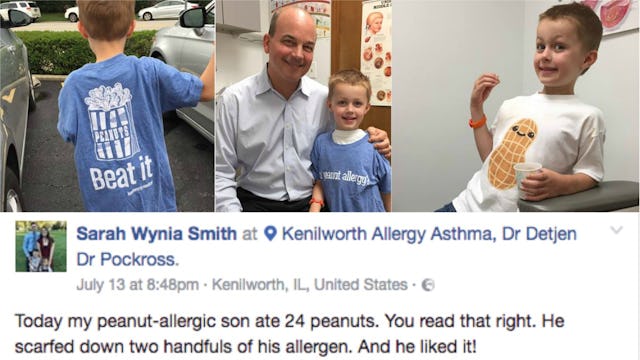 Oral immunotherapy (OIT) is a new, experimental treatment for food allergies that, when performed early in a child’s life, shows promise of helping kids build up enough of a tolerance to their allergens to safely eat cross contaminated food, erasing the constant worry that kids and their families feel when living with food allergies. In a viral post, one mom described her child’s experience with OIT at a clinic in Illinois that specializes in the procedure, writing, “Today my peanut-allergic son ate 24 peanuts. You read that right. He scarfed down two handfuls of his allergen. And he liked it!”