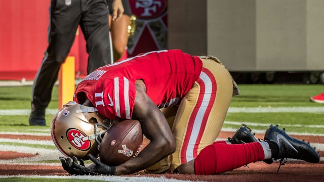 Goodwin’s touchdown was the first of the game on Sunday, and came in the second quarter when quarterback C.J. Beathard hit him for an 83-yard score. As he beat the last defender, Goodwin blew a kiss to the sky. Once he made it safely into the end zone he crossed himself, then fell to both knees and bent over at the waist, his forehead to the turf, his head in his hands, the football cradled in his left arm.