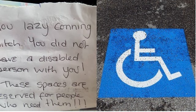 Mom Emma Doherty shared a picture of a note left for her after she parked in an accessible spot at Alder Hey Children’s Hospital in Liverpool, where she was taking her son to an appointment. “You lazy conning b-tch,” the note read. “You did not have a disabled person with you! These spaces are reserved for people who need them!!!”