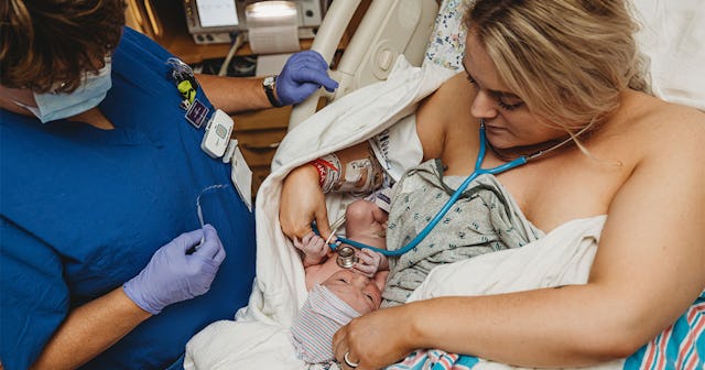 “She told me the one big thing she wanted to do was ‘do her job’ for her own baby! Of course I was like, ‘UHHHHH you’re going to be able to get up out of bed and stand at the warmer an hour after you’ve just popped a baby out?’ She had clearly thought about this more than I had – because she was like, ‘No! I’ll have them bring everything to me.’ And that she did! Her birth was magical and went so perfectly that when that golden hour was over and it was time to do his newborn exam, she did it all from her bed,” Mooney told Scary Mommy.