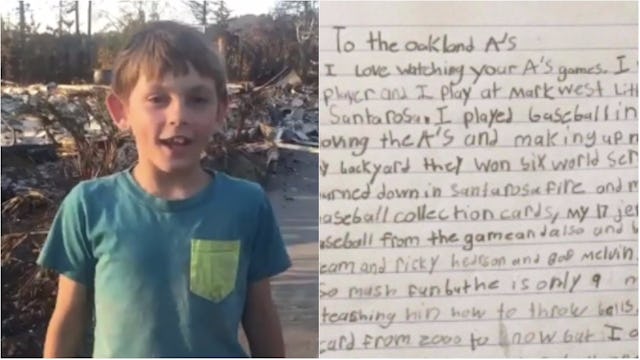 I love watching your A’s games. I want to be an A’s player and I play at Mark West Little League in Santa Rosa. I played baseball in my backyard all day loving the A’s and making up my own game. In my backyard they won six World Series in a row. But my house burned down in the Santa Rosa fire and my saddest things was my baseball collection cards, my 17 jerseys and 10 hats and my baseball from the game and also a ball signed by the whole team and Rickey Henderson and Bob Melvin. My brother and me have so much fun but he is only 9 months old. I am teaching him how to throw balls. I have every single A’s card from 2000 to now but I am 9-years-old. I had a major league baseball and it all burned up. So sad. I know you are not all together but hope they get this.