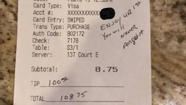 She described the moment another waitress told her about the tip, after the man had quietly left.
