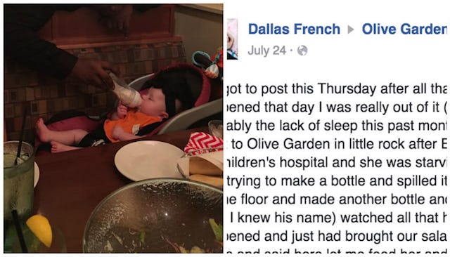 Little Rock mom Dallas French wrote on the Olive Garden Facebook page earlier this week that she, her husband, and their daughter, Ellee, stopped for dinner on their way home from some medical testing. “I was really out of it (and probably from the lack of sleep this past month),” she wrote, “but we went to Olive Garden in little rock after Ellee’s tests at children’s hospital and she was starving and I was trying to make a bottle and spilled it all over me an the floor [sic].”