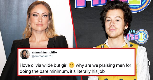 That’s a sweet tribute and all, but fans were quick to point out that the things Wilde was lavishing Styles with praise over are… kind of the bare minimum. “i love olivia wilde but girl why are we praising men for doing the bare minimum. it’s literally his job,” reads one tweet.