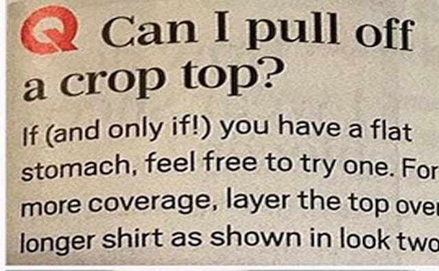 The latest issue of O Magazine hit the stands July 8, and readers are understandably pissed about some of the publication’s fashion advice. In the section of the mag that has a fashion Q and A, a reader asked, “Can I pull off a crop top?” The magazine answered, “If (and only if!) you have a flat stomach, feel free to try one.”