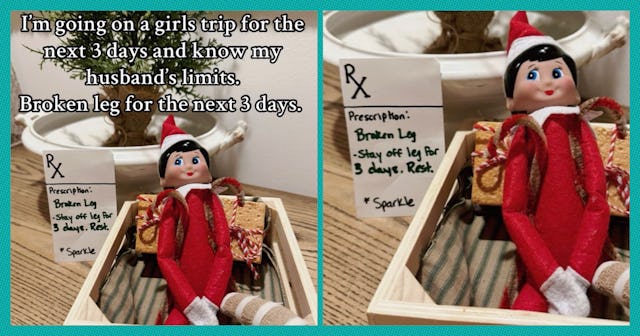 This mom clearly didn’t trust her husband to be able to follow through with three days' worth of Elf on the Shelf duties, and so, Sparkle broke their leg, absolving her husband of any sort of mental or physical labor that comes with the elf.