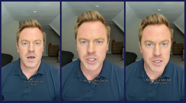 When you have a baby, you learn pretty quickly that motherhood and fatherhood are not exactly the same. Your hormones and bodies and psyches and personal baggage all react differently to the new child in your lives, sure. Most of all, you’re quickly shown that society has very different expectations for the two of you. Stay-at-home dads walk an interesting line, taking charge of the domestic sphere (traditionally seen as a woman’s domain) but still being held to ye olde standards of masculinity (make money, drag home meat to cave, be strong, et cetera). And one dad on TikTok says being a SAHD has made him understand more about the role often assigned to the woman of the house — so much so that he now resents other men.
