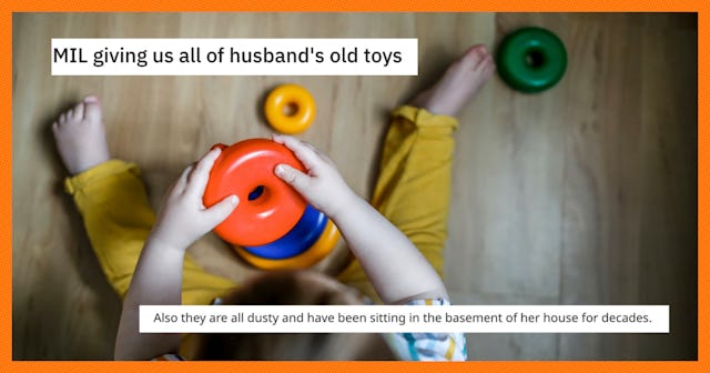 “MIL is giving us my husband's childhood toys - big toy trucks, Legos, etc. for my 8 month old baby to play with,” she began.