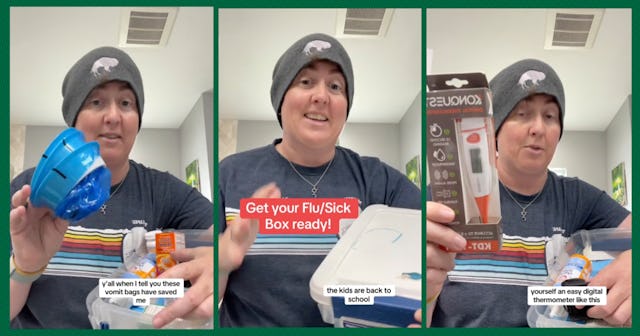 “The kids are back to school. It is almost cold and flu season, and I guarantee you your kids will get sick at the least convenient time, so let's get your flu box ready,” TikTok mom and doctor @Beachgem10 begins before launching into her “sick box” must-haves, including disposable vomit bags, pain killers, and the right kind of thermometer.