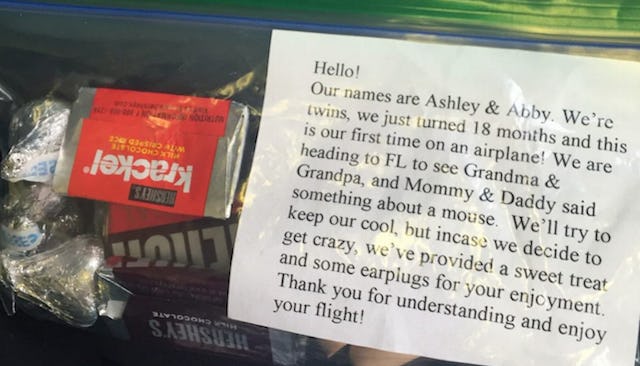 “Hello! Our names are Abby and Ashley. We’re twins, we just turned 18 months, and this is our first time on an airplane,” the note said. “We are heading to Florida to see Grandma and Grandpa, and mommy and daddy said something about a mouse. We’ll try to keep our cool, but in case we decide to get crazy, we’ve provided a sweet treat and some earplugs for your enjoyment. Thank you for understanding and enjoy your flight.”