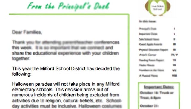It looks like people are rather upset over kids not being able to show off their costumes at school, as though this is some great loss for their education. I can’t help but wonder how much good could be accomplished on behalf of Milford students if these parents directed their outrage at something that truly mattered. Not to mention, according to the letter sent home, the school is still doing quite a bit to recognize Halloween. From the reactions of these parents, you’d think the school was abolishing Halloween celebrations of any sort.