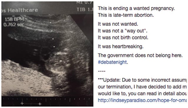 “I was watching the [third presidential debate] and when I heard Trump say that late-term abortions were ripping babies out at nine months, I went into a full panic attack and started sobbing because I couldn’t believe people actually thought that happens, so I had to share my story and set things straight,” Paradiso told BuzzFeed Health.
